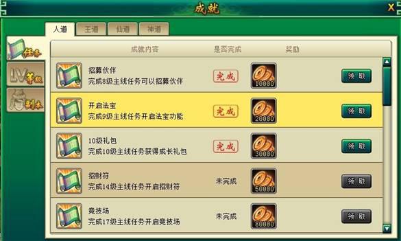 成就系统的人道分为:任务系统、等级系统、副本系统,只要达成成就需求,就可以领取到相应的奖励。